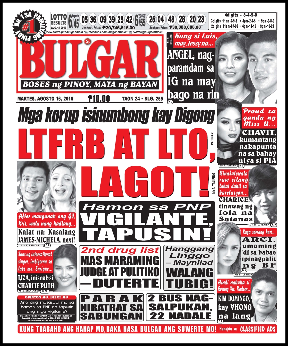 The Number 1 Daily Newspaper Tabloid in the Philippines (Nielsen and IPSOS media research) For inquiries, call us at 02-7328603 or 02-7496094. Email us at ads[at]bulgar.com.ph.