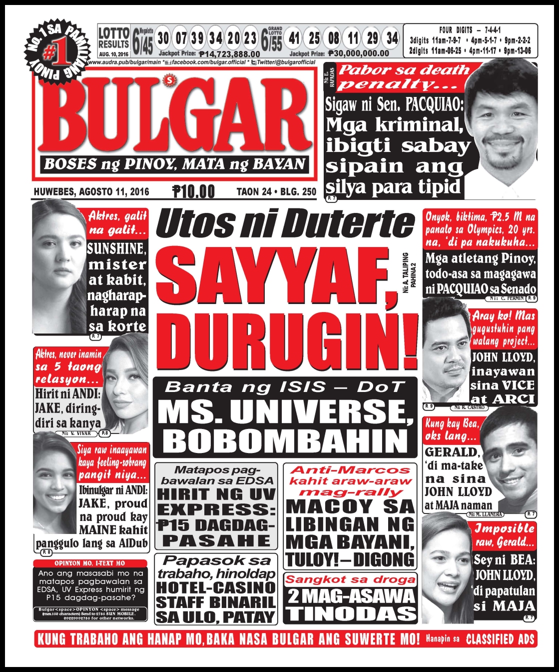 August 11, 2016 BULGAR: BOSES NG PINOY, MATA NG BAYAN